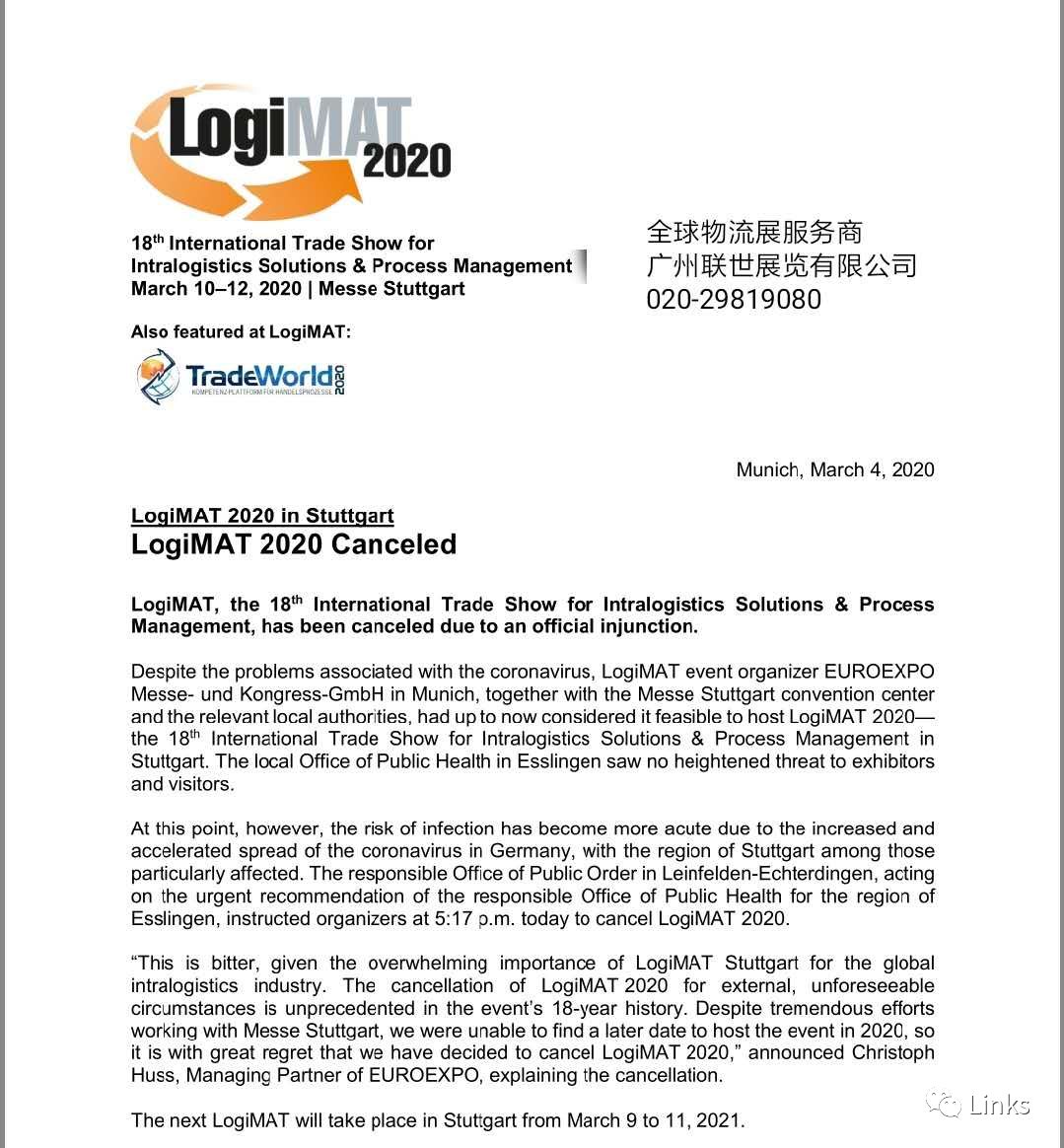 取消举办原定于2020年3月10日-12日在德国斯图加特展览中心举办的LogiMAT 2020。